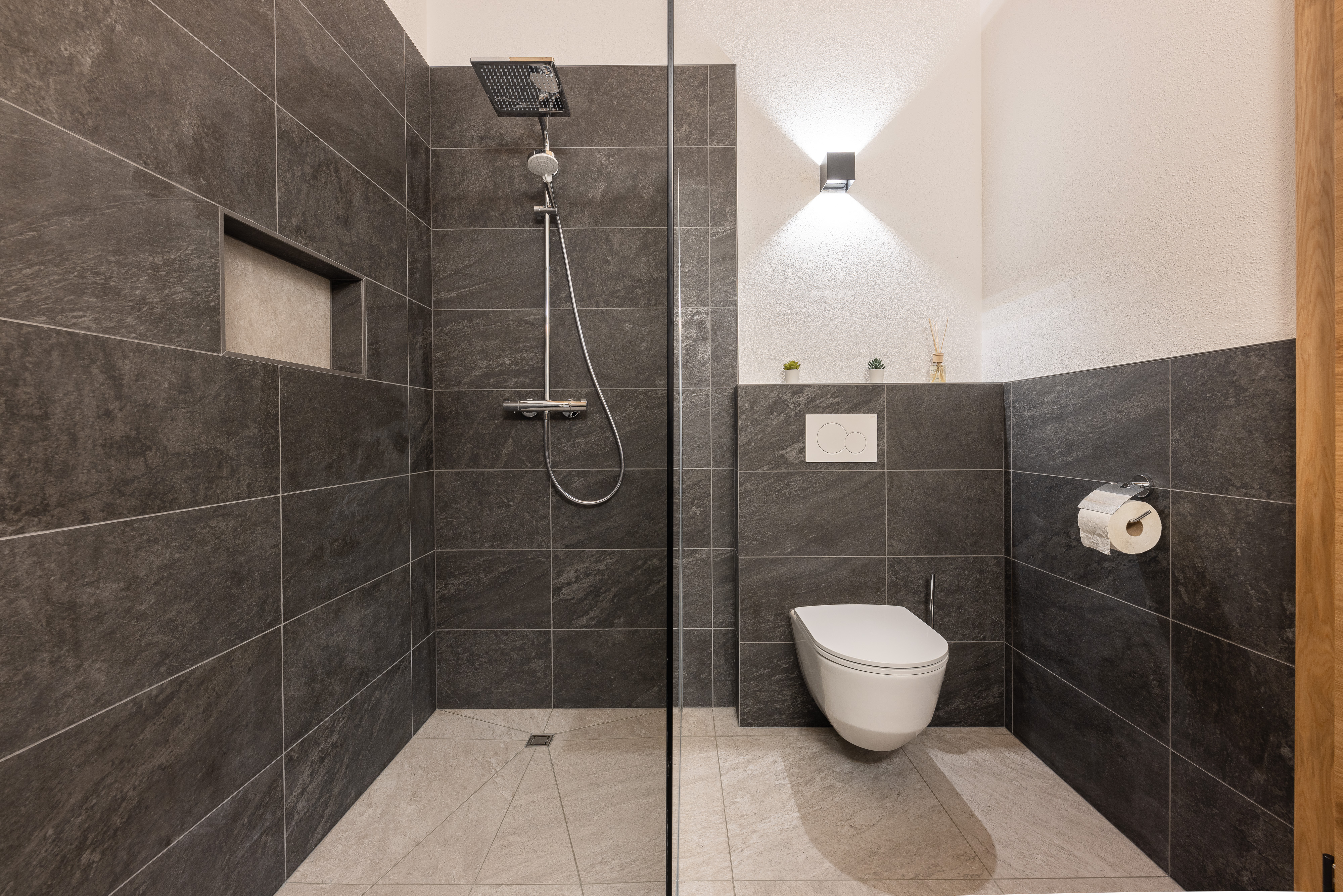 Das Badezimmer ist mit einer barrierefreien Dusche, Waschbecken, Föhn, Handtuchtrockner und einem WC ausgestattet.