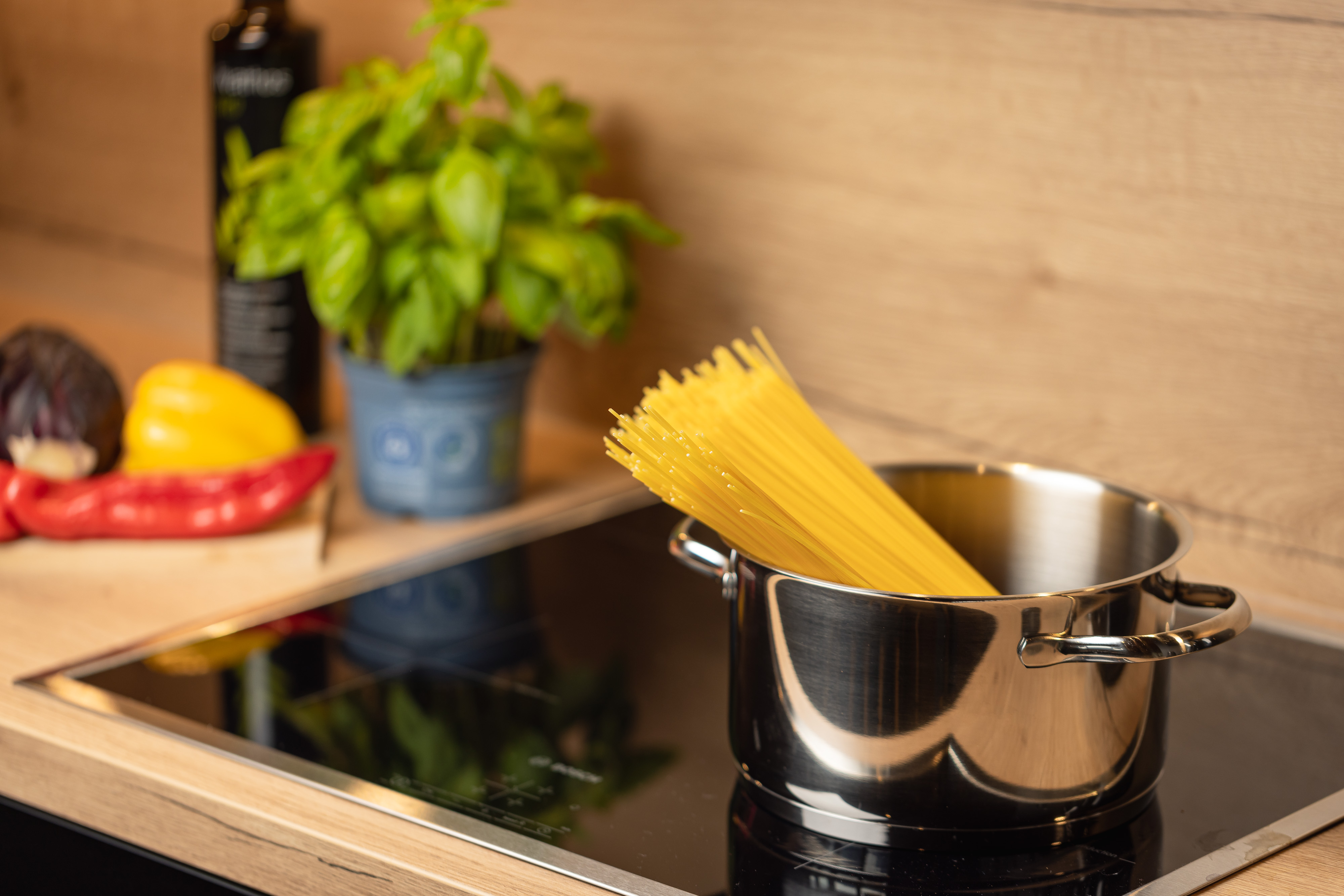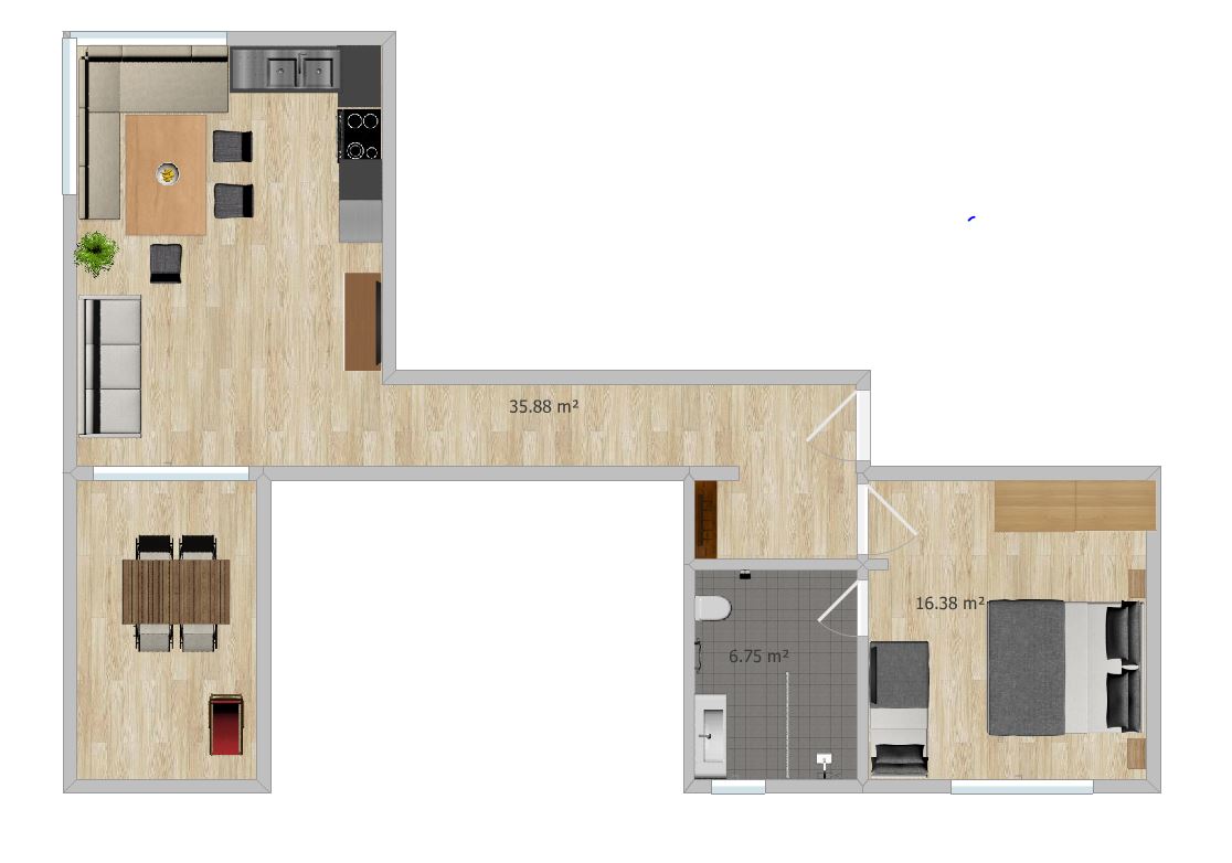 Das Wohnzimmer ist mit einer gemütlichen Sitzecke, einer Wohlfühl Couch und einer komplett ausgestatteten offenen Küche ausgeführt.