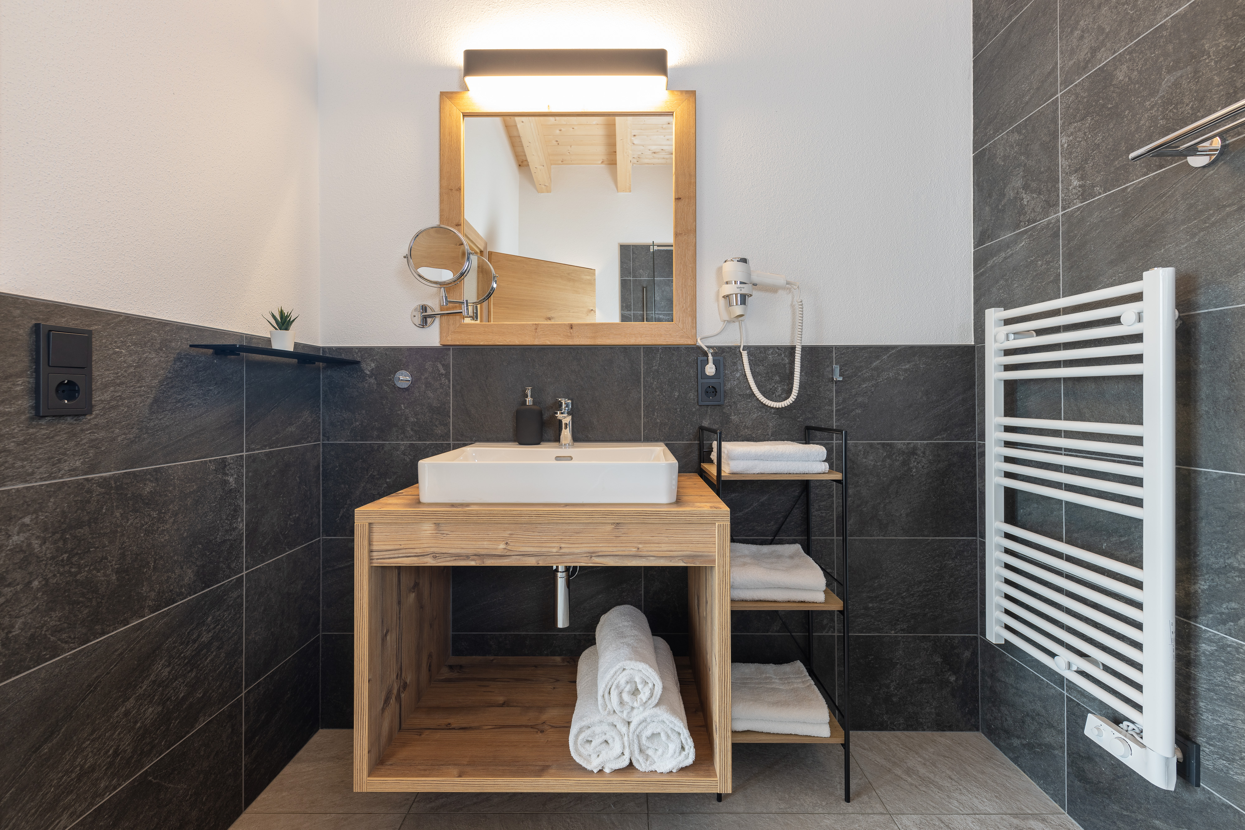 Das Badezimmer ist mit einer barrierefreien Dusche, Waschbecken, Fön, Handtuchtrockner und einem WC ausgestattet.