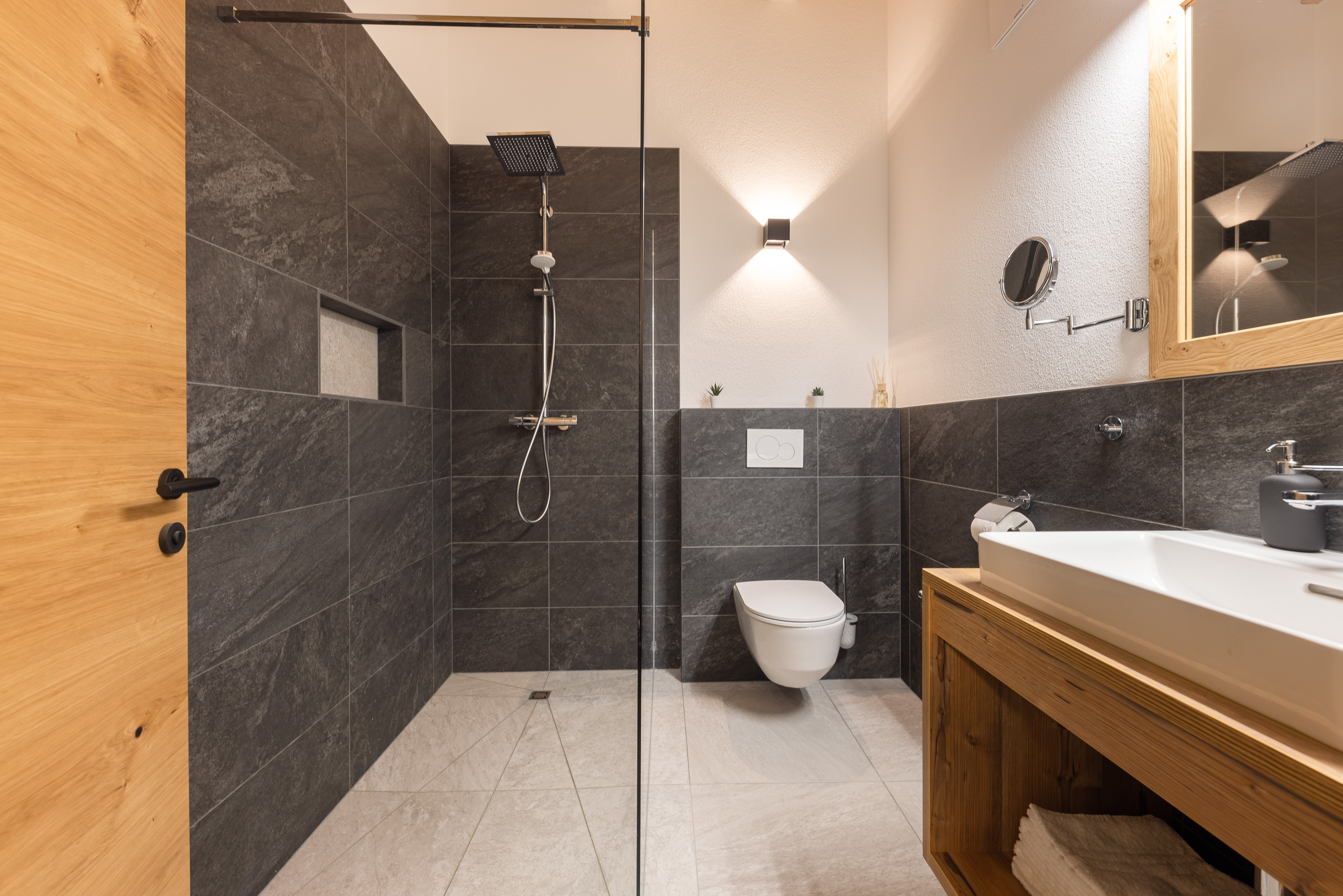 Jedes Schlafzimmer besitzt ein eigenes Badezimmer (Zugang vom Zimmer) mit barrierefreier Dusche, Waschbecken, Fön, Handtuchtrockner und einem WC.